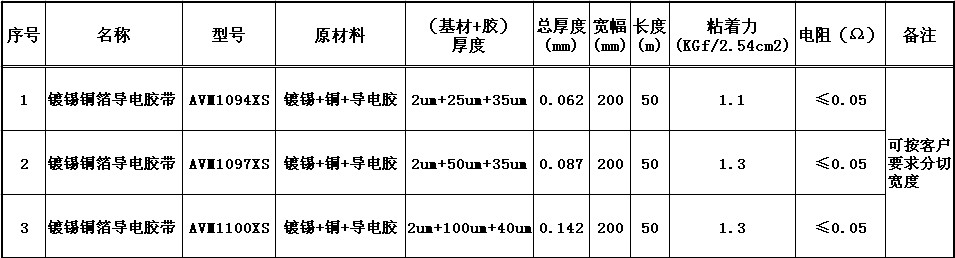 由于使用鍍錫銅箔膠帶的行業(yè)不是很多很廣,蘇州艾飛敏公司主要推出了3款雙導(dǎo)鍍錫銅箔膠帶,相關(guān)規(guī)格與參數(shù)如下。