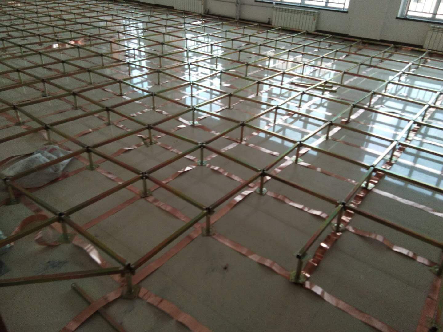 10、如在防靜電要求較高的場(chǎng)所可以在支架下面加裝導(dǎo)電銅帶以提升導(dǎo)電效果,在地板支架下面橫豎排列整齊,板面常用的規(guī)格有2×0.05 ~4×0.08 ~6×0.5MM ,不同的防靜電環(huán)境需求選用不同的規(guī)格,按甲方設(shè)計(jì)需求施工。